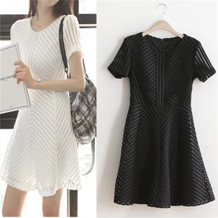 2015夏季新款女裝 韓版條紋鏤空時尚修身A字短袖夏裝連衣裙 /