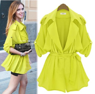 2014歐洲站春秋季新款歐美女裝大翻領肩章抽袖寬松風衣外套 /