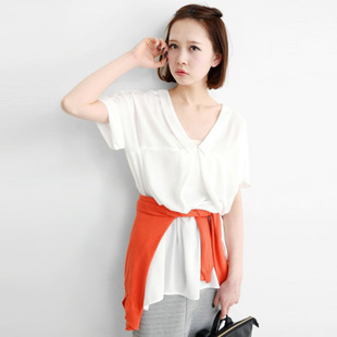 2015夏季新款女韓國品牌翻領(lǐng)短袖雪紡衫外貿(mào)原單大碼女士雪紡衫 /