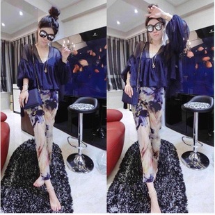 歐洲站2015春夏裝新款大碼雪紡衫上衣印花九分褲時尚休閑套裝女潮 /