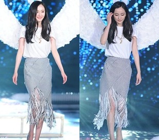 快樂大本營楊冪同款套裝女純棉T恤千鳥格流蘇包臀半身裙一件代發 /