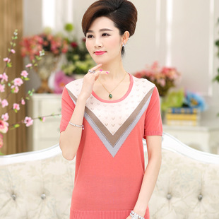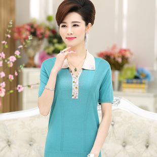 純色休閑短袖女式針織衫 夏季新品女式毛衣 鑲鉆中老年女裝批發 /