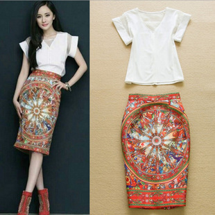 楊冪同款氣質顯瘦V領襯衫復古印花包臀半裙兩件裙套裝原版好質量 /