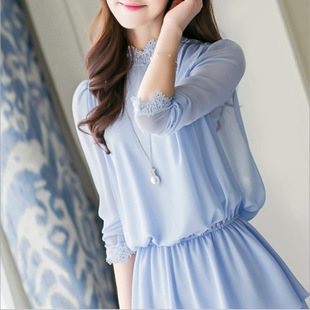 2015春裝新款女裝小衫韓版立領寬松蕾絲雪紡衫打底上衣夏中長款 /