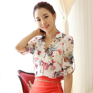 2015春夏裝新款韓版雪紡襯衫女中長袖上衣女裝寬松夏秋花襯衣 /