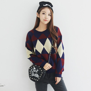 • 春季新款女裝 休閑時尚菱形氣質(zhì)圓領(lǐng)長袖套頭女式針織衫毛衣 批發(fā) /