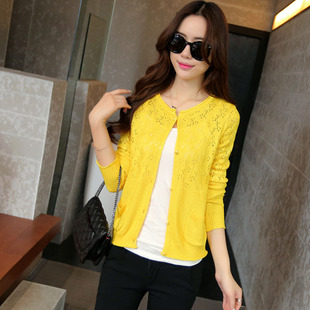 2015夏季韓版新款鏤空圓領長袖釘珠針織開衫女式百搭外套S204T /