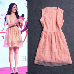 2015夏季新品女裝批發(fā) 郭碧婷同款歐根紗刺繡圓領(lǐng)修身無袖連衣裙 /