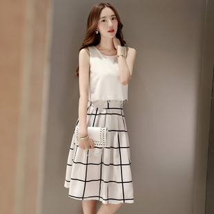 2015夏季新款中長款淑女時尚寬松圓領無袖格子雪紡連衣裙兩件套裝 /