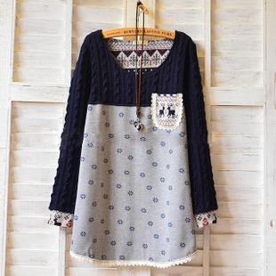 2014秋冬季新款日系森女風雪花小鹿女寬松大碼毛線拼接衛衣 /