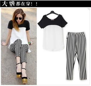 春夏新款印花字母+條紋九分哈倫褲套裝百搭時尚 /
