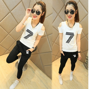 2015新款夏裝女裝韓版 時尚露肩顯瘦短袖女士休閑套裝 運動裝女潮 /