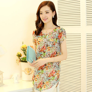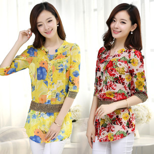 2015夏季新款韓版雪紡襯衫 顯瘦碎花大碼OL裝中長款短袖批發 /