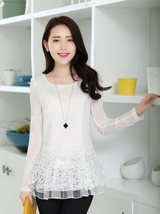2015 春裝新款t恤女長袖韓版中長款甜美修身蕾絲衫 /