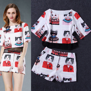 柯飛曼 2015春夏新款女裝 歐根紗貓咪短袖T恤印花短褲套裝直筒褲 /