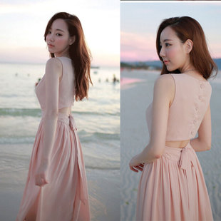 2015夏新款波西米亞女裝長裙 修身性感漏背雪紡連衣裙 /