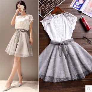 夏季新款名媛女裝兩件套連衣裙中裙蕾絲短袖套裙紗網裙套裝女 /