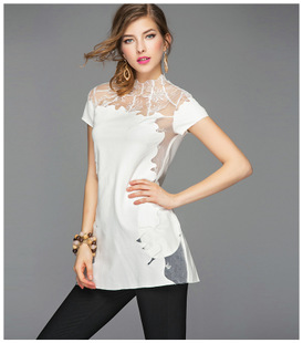 歐洲站蕾絲t恤中長款修身高端女裝2015夏季新款立領短袖上衣807長 /