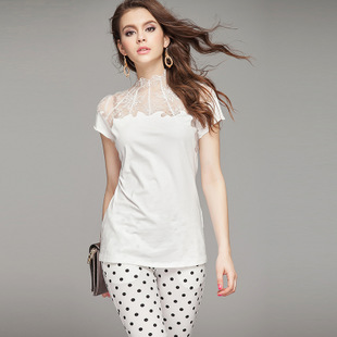 歐洲站2015蕾絲網紗拼接T恤女短袖甜美性感立領打底衫潮 807短 /