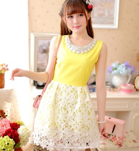 模特實拍 2015新款日系甜美清新圓領鑲鉆拼接無袖背心裙 /