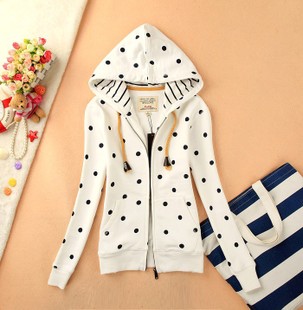 簡介: 建議零售價 ¥599.00 貨號 982 產地 上海 主圖來源 實拍無模特 貨源類別 現貨 是否庫存 是 庫存類型 整單 風格 韓版 圖案 波點 面料 純棉 款式 開衫 版型 修身型 組合形式 單件套 衣長 普通款(50cm<衣長≤65cm) 袖長 長袖 袖型 常規袖 領型 連帽/帽領 衣門襟 拉鏈 厚薄 普通 流行元素 口袋 上市年份/季節 2014春季 顏色 白色,藏青色 尺碼 160,165,170