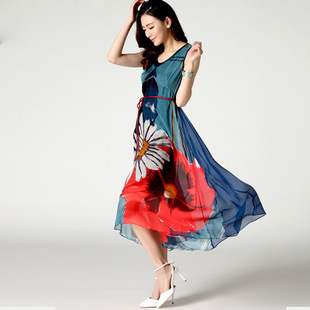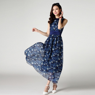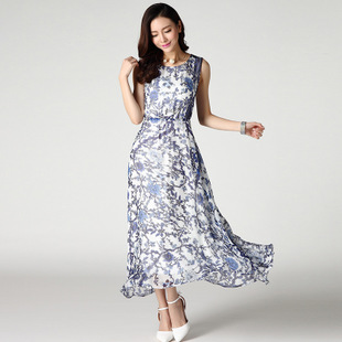 2015新款夏季真絲連衣裙 印花圓領無袖收腰修身顯瘦長裙連衣裙 /