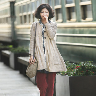 新款秋冬羊毛針織開衫 米色毛衣森女日系長款女裝 文藝復古毛衣 /