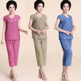 中老年夏季亞麻短袖套裝女士休閑短袖T恤七分褲子棉麻兩件套奶奶 /