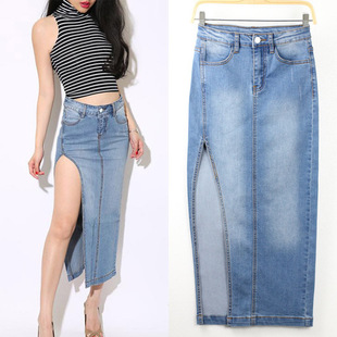 2015春夏新款歐美李小璐同款性感側開叉牛仔包臀顯瘦半身裙長裙 /
