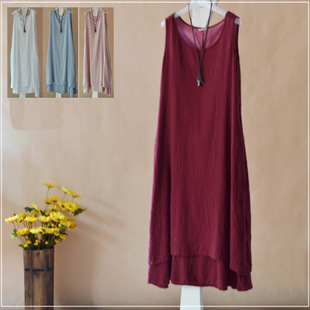 夏裝新款 簡約文藝范寬松背心棉麻連衣裙 假兩件雙層棉紗長裙 /