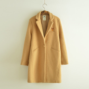 日系森女卡通刺繡口袋羊毛呢子西裝領外套女呢子大衣 /
