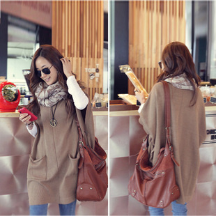 韓國新款秋冬大碼套頭毛衣短袖雙口袋羊線針織衫毛線外套毛衣女 /
