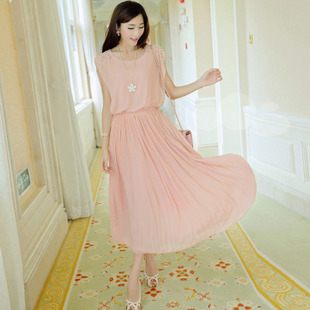 夏裝女裝甜美高檔無袖連衣裙大碼釘珠百褶裙雪紡長裙淘寶代理分銷 /