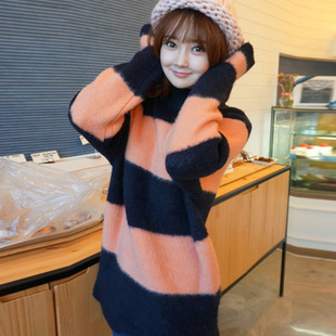 東大門韓版毛衣大碼女裝羊絨衫半高領中長款條紋套頭毛衣雙層加厚 /