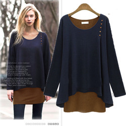 批發2014歐美大碼女裝新款寬松莫代爾不規則假兩件套長袖女T恤 /