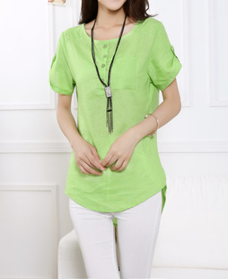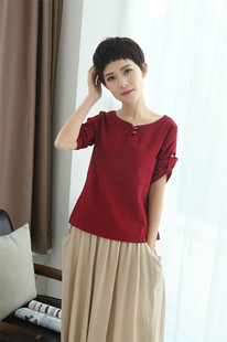2015春裝新款亞麻圓領文藝小清新上衣純色短袖七分袖襯衫 /