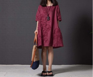 2015春夏大碼女裝純色文藝范小清新寬松繡花短袖棉麻連衣裙 /