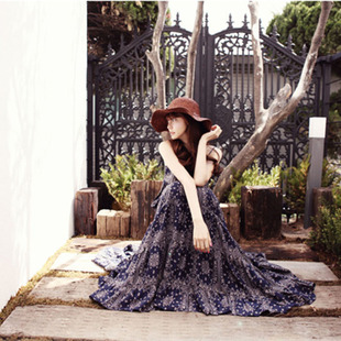 夏裝新款 大碼綿綢大擺裙波西米亞 民 族風碎花吊帶連衣裙長裙 /
