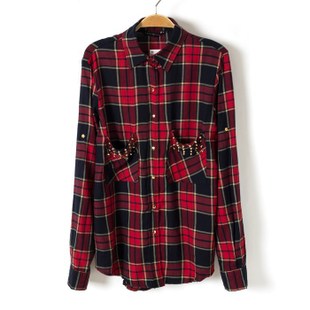 批發(fā)2013新款女裝歐美秋冬翻領(lǐng)長袖口袋鉚釘格子襯衫上衣襯衣 /