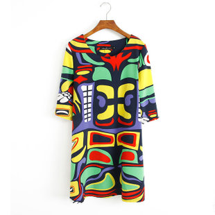 批發(fā)2014夏季新款彩繪小鳥圖案寬松大碼圓領(lǐng)A字連衣裙中袖短裙 /