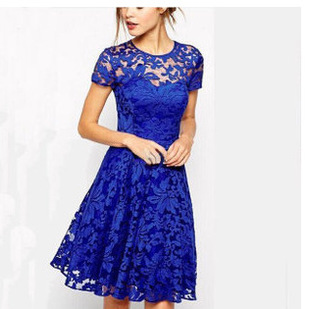 2015歐美熱賣新款氣質時尚圓領短袖藍色蕾絲花邊連衣裙 /