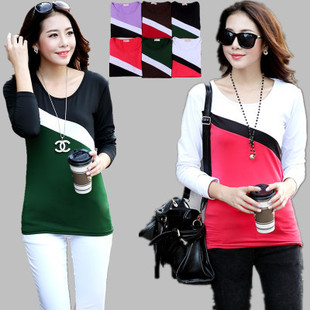 廠家地攤貨源 14年新款秋裝女士牛奶絲打底衫長袖拼色t恤 上衣女 /