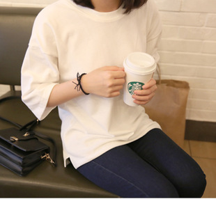 韓版學院風百搭簡單寬松側開叉短袖T恤純色打底T恤 /