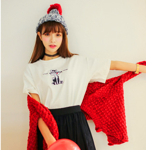 2015新款 寬松小落肩松鼠刺繡百搭短袖T恤 /