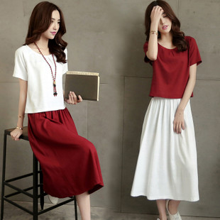 韓版寬松優雅文藝復古棉麻撞色兩件套大擺中長款連衣裙一件代發 /