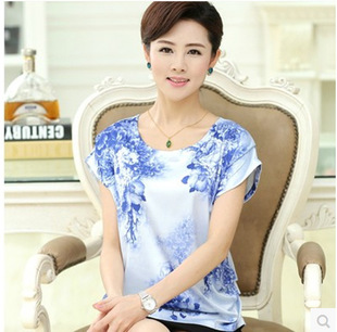 中老年女裝夏裝真絲上衣大碼雪紡衫中年短袖青花瓷T恤襯衫媽媽裝 /