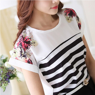 雪紡衫2015夏裝新款女裝上衣 寬松韓版大碼打底衫短袖印花條紋t恤 /