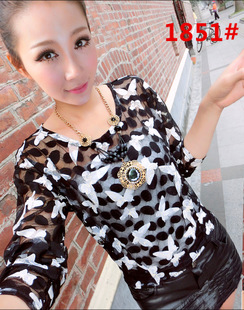 2015春夏新款圓領T恤蝴蝶印花蕾絲打底衫修身長袖打底衫送大禮 /
