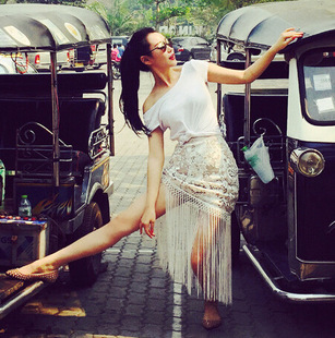 左岸瀟同款一字領性感露肩T恤鏤空蕾絲連衣裙流蘇長裙套裝 /
