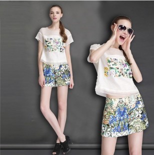 2015 夏新款女裝歐美撞色鏤空網紗印花大碼女套裝裙 /